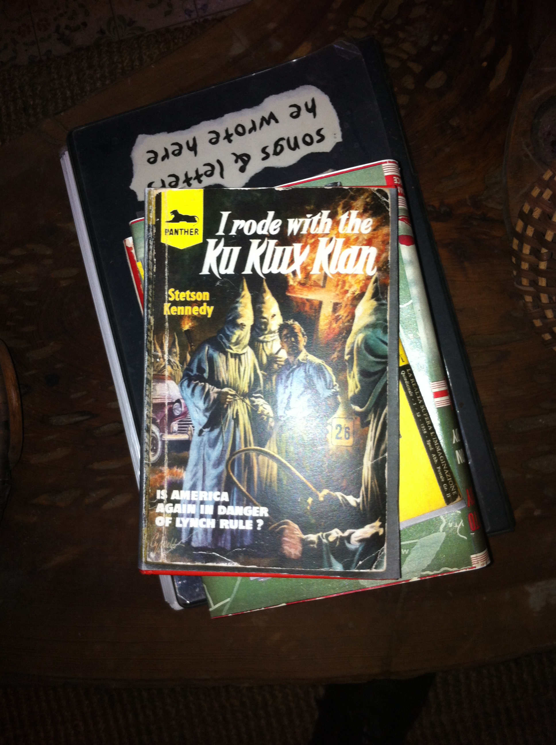 A copy of Stetson Kennedy’s book “I Rode with the Ku Klux Klan”. Actually, it’s a prop. Kennedy’s stepdaughter put the ancient sleeve on another book.